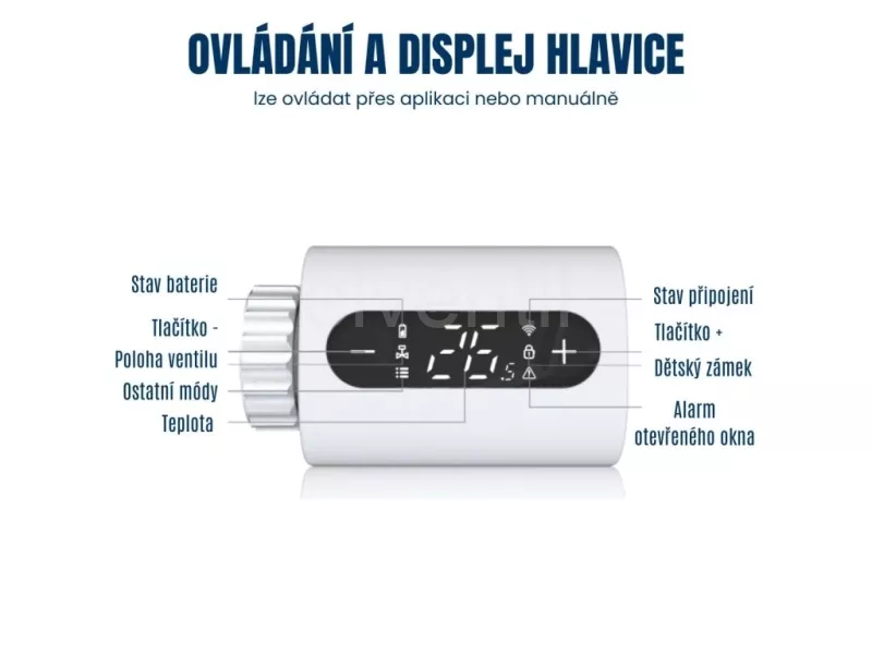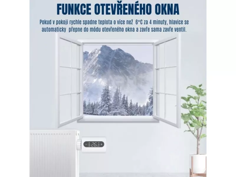 • Detekce otevřeného okna: Při náhlém poklesu teploty dočasně omezí topení, což přispívá k úspoře energie.