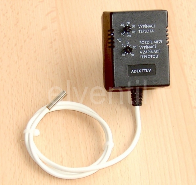 Elektronický termostat ADEX TTUV se skládá z řídícího modulu TTUV1, spínacího modulu TTUV2 a teplotního čidla. Řídící modulTTUV1 zajišťuje nastavení vypínací teploty termostatu a diference (rozdílu) mezi vypínací a zapínací teplotou termostatu. Knastavení těchto parametrů Slouží dva samostatné nastavovací prvky. Spínací modul TTUV2 zajišťuje napájení termostatu TTUV aobsahuje výstupní relé s přepínacím kontaktem. Spínací modul je vestavěná do plastové krabičky se síťovou vidlicí. Teplotní čidlo se dodává s přívodem 180 cm.