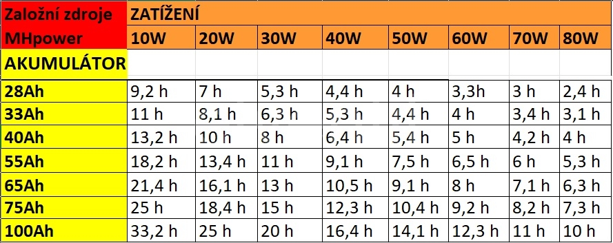 Příklady použití a doby zálohování, stáří baterie do dvou let. :